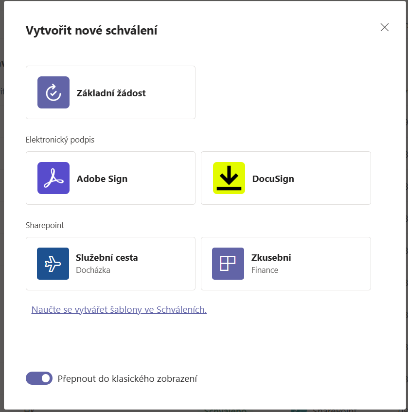 Pokud by daný předpřipravený formulář nevyhovoval, je možné vytvořit si vlastní šablonu schválení.