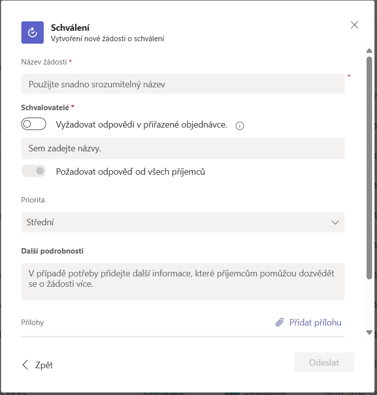 Ve schvalovací žádosti se zadá Název žádosti, zvolí se schvalovatelé, priorita, případně příloha. Navolit je též možné text vlastních odpovědi.