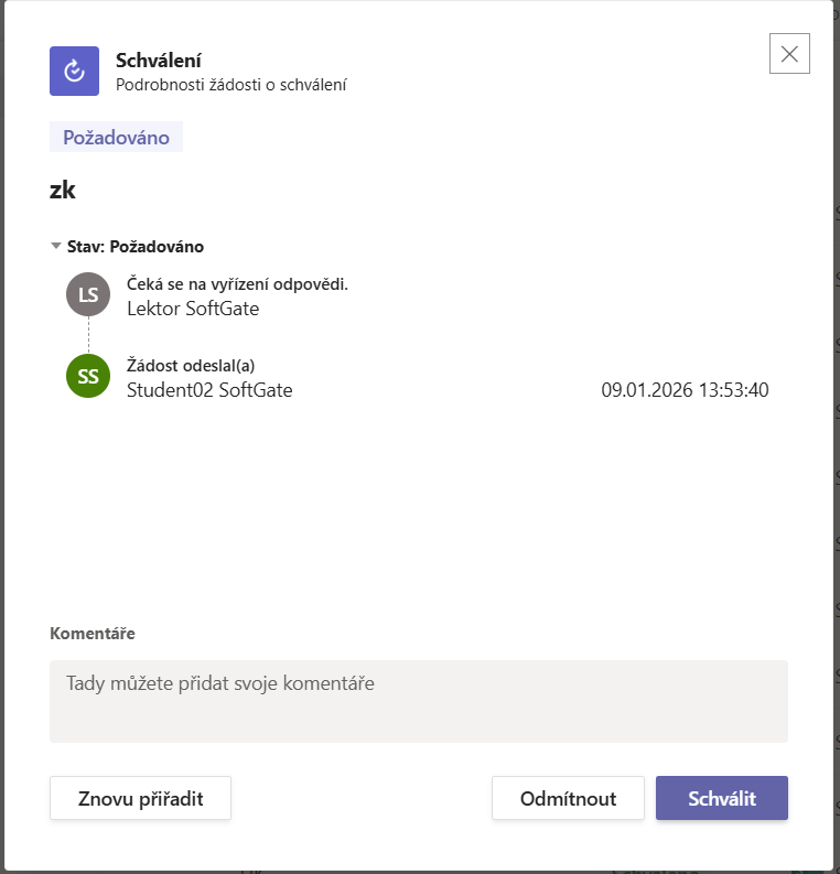 Daná žádost je následně buď schválena či odmítnuta. Schvalovatel rovněž může delegovat schválení na někoho jiného volbou – znovu přiřadit.
