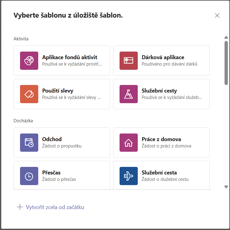 Při vytváření nové šablony je možné jít od začátku nebo vyjít z předem připravených vzorů (odchod, přesčas, atp.)