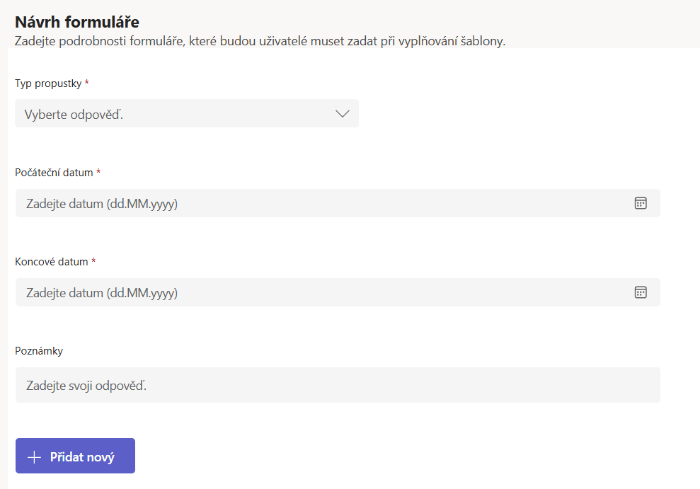 V návrhu formuláře je možné navolit vlastní položky pro schvalovací proces.