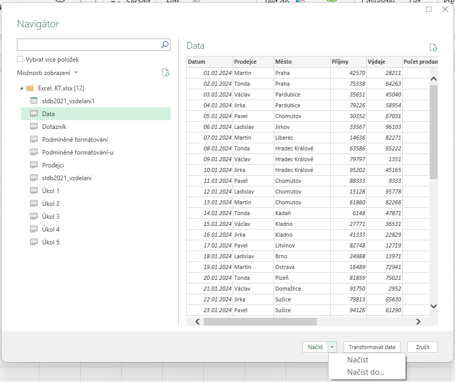 Načíst do – umožňuje načtení do kontingenční tabulky (příp. kontingenčního grafu či jen vytvořit připojení)