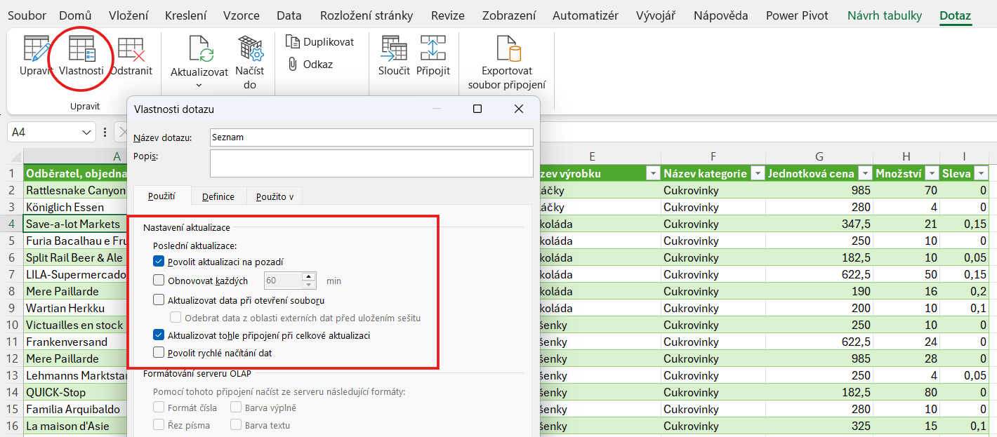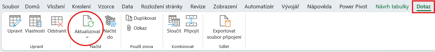 Pokud se zdrojová data mění, je nutné myslet na aktualizaci dat. Aktualizace dat funguje dobře, pokud v datovém zdroji: