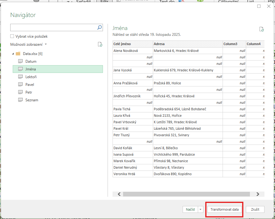 Transformovat – umožňuje upravit data před samotným načtením, transformace dat pomocí PQ nemění původní datový zdroj!