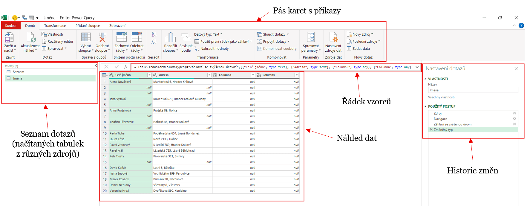 Tím se dostaneme do okna editoru Power Query, kde je možné samotnou transformaci provést.