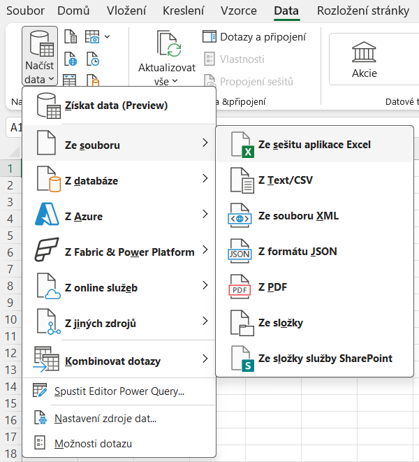 Power Query obsahuje řadu datových konektorů, pomocí kterých je možné se připojit k externím datovým zdrojům (soubory MS Excel, csv, databáze, online zdroje). Z těchto datových zdrojů je možné data přímo načíst či před načtením upravit.