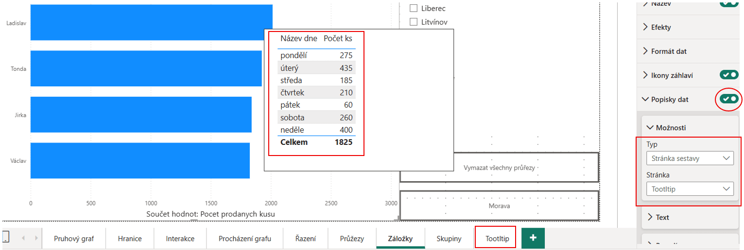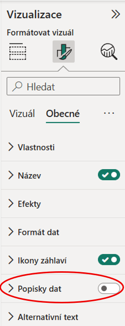 Tento tooltip je možné zapnout/vypnout a případně upravit na kartě Vizualizace → Formátujte vizuál → Popisky dat